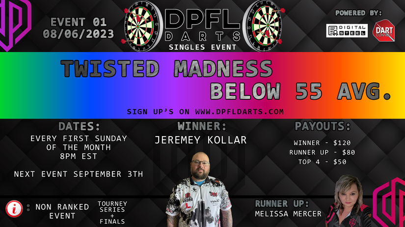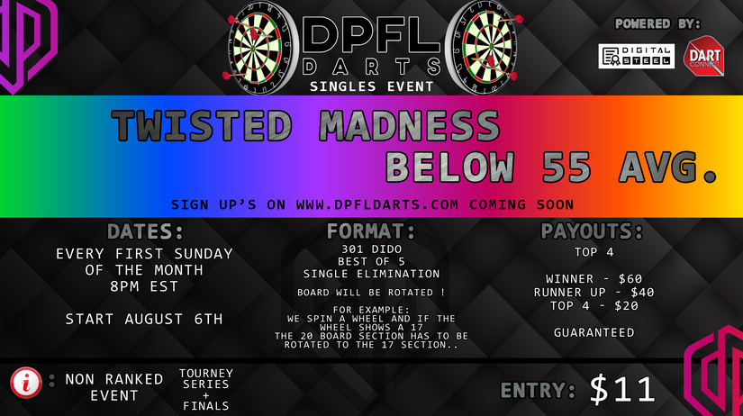 Eligibility: To participate, you must have a Dartconnect competition card with an average of 55 and below !